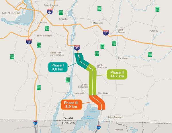 La construction de l’autoroute 35 entre Saint-Jean-sur-Richelieu et la frontière américaine a été réalisée par phases. Les segments des phases I et II (entre Saint-Jean-sur-Richelieu et Saint-Sébastien) sont en service depuis 2014, et la phase III (entre Saint-Sébastien et Saint-Armand) s’est achevée en septembre 2025. À partir de cet endroit, l’autoroute 35 rejoint la route 133, qui comporte déjà deux voies par direction, sur chaussée séparée, jusqu’à la frontière américaine.