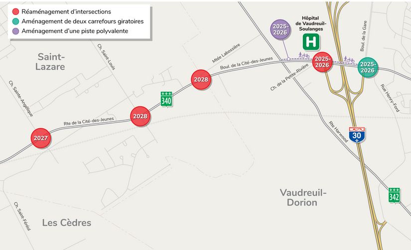Le réaménagement de la route 340 (boulevard et route de la Cité-des-Jeunes) à Vaudreuil-Dorion et à Saint-Lazare est requis pour assurer la fluidité des déplacements en prévision de l’ouverture du nouvel hôpital régional Vaudreuil-Soulanges.